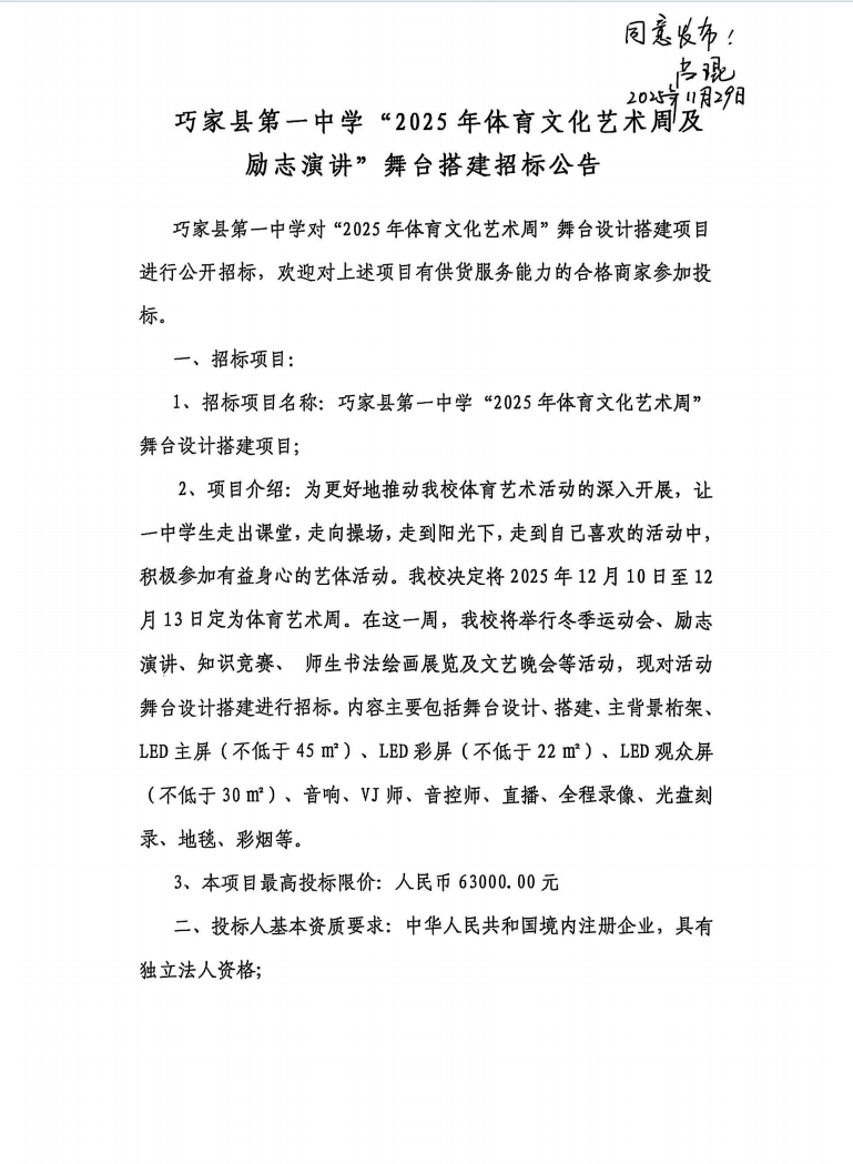 1 巧家县第一中学“2025年体育文化艺术周及励志演讲”舞台搭建招标公告
