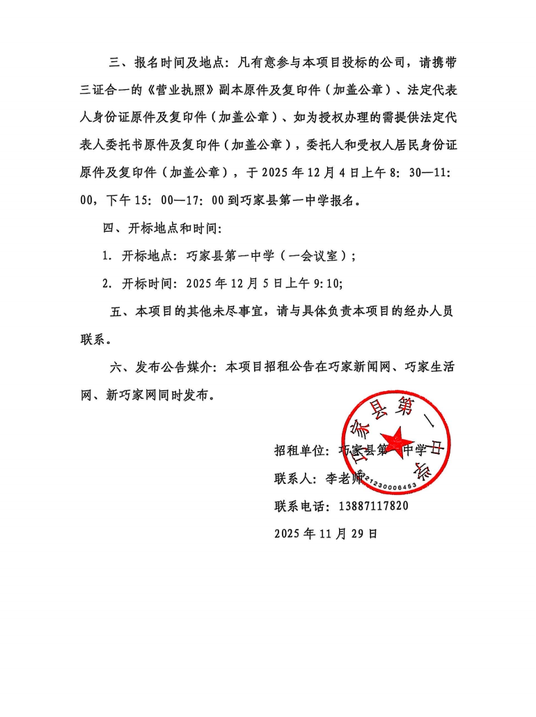 巧家县第一中学“2025年体育文化艺术周及励志演讲”舞台搭建招标公告